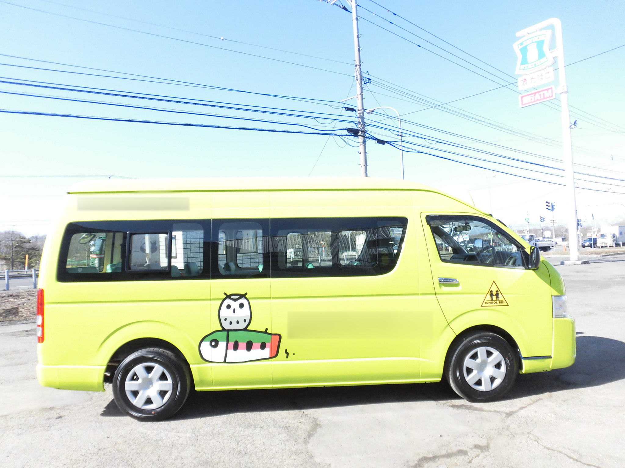 園名にちなみ塗装のお色は緑に施工しました。あわせて窓からのぞく椅子のカバーもお揃いに♪シンプルに園名ステッカーとキャラクターロゴのみのデザインですが、ひと目で園様と認識が出来るお車となっております!ホームページはもちろん課外活動のクラブのT-シャツにも使われている親しみのあるキャラクターなのです(*^^*)